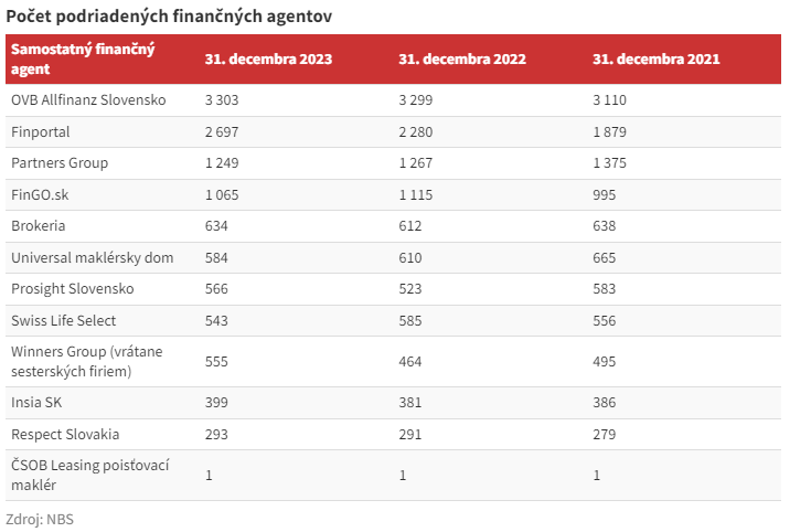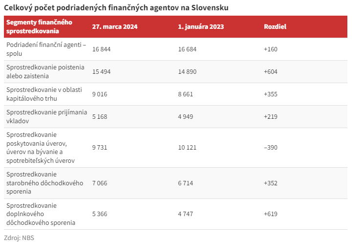 Hoci najväčší finanční sprostredkovatelia pôsobiaci na slovenskom finančnom trhu označujú uplynulý rok za jeden z náročnejších v doterajšej histórii, počty finančných agentov im aj naďalej rastú. V súčasnosti činnosť podriadených finančných agentov vykonáva podľa údajov Národnej banky Slovenska (NBS) spolu až 16 844 subjektov. Približne pred rokom ich bolo o 160 menej.